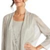 This modest mother of the bride pant suit features a sleeveless round neckline with matching long sleeve jacket .