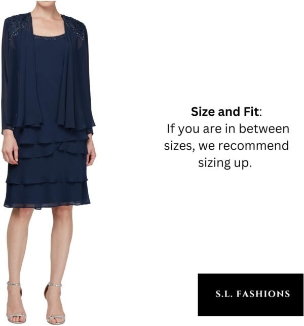 Elevate your formal wardrobe with the S.L. Fashions women’s two-piece dress with embellished jacket. This elegant set includes a sleeveless lined chiffon dress with a beautifully beaded embellished scoop neckline and a high-low tiered hemline, offering a sophisticated and chic look. The dress is complemented by a removable open-front jacket, featuring long sleeves, lace and beaded shoulder details, and shoulder pads for a structured and refined silhouette. The hem hits at the calf, providing a flattering fit for all body types. perfect for mothers of the bride or groom, this traditional ensemble combines timeless style with modern touches, making it the ideal choice for weddings, receptions, and other formal events. The intricate embellishments and classic design ensure you’ll look and feel your best, making unforgettable memories on your special day.